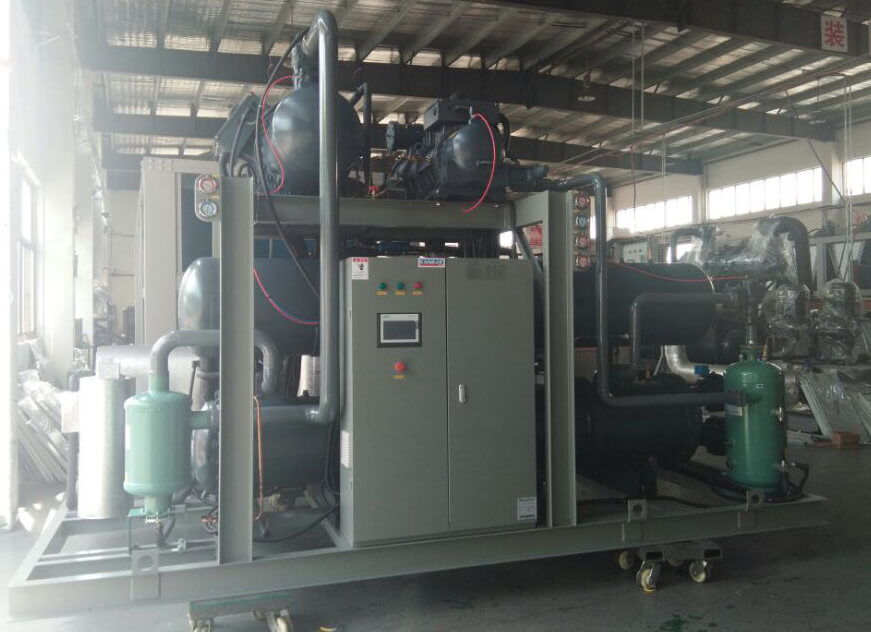 2.三元復(fù)疊超低溫深冷制冷機組:其由高溫級(R404A/R22)、低溫級R23、超低溫級(R14)組合而成,低溫可提供-120℃超低溫工藝?yán)湓?。機組制冷量范圍為3kw~300kw。