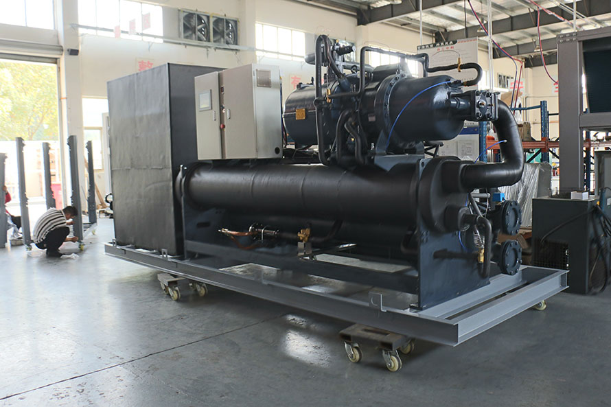 2、水冷式螺桿式工業(yè)冷凍機組,通過冷卻塔以冷卻循環(huán)水為冷凝方式的控溫設(shè)備;