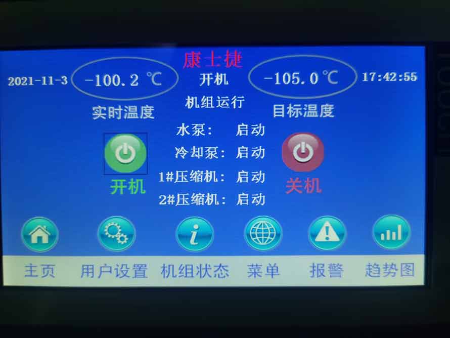 康士捷生產(chǎn)的-100度超低溫制冷機(jī)組 復(fù)疊式冷凍機(jī)組采用二元復(fù)疊就可以達(dá)到零下100度,在公司試運(yùn)行4個(gè)小時(shí),運(yùn)行穩(wěn)定。正負(fù)溫度5度,低溫度可達(dá)-105度。